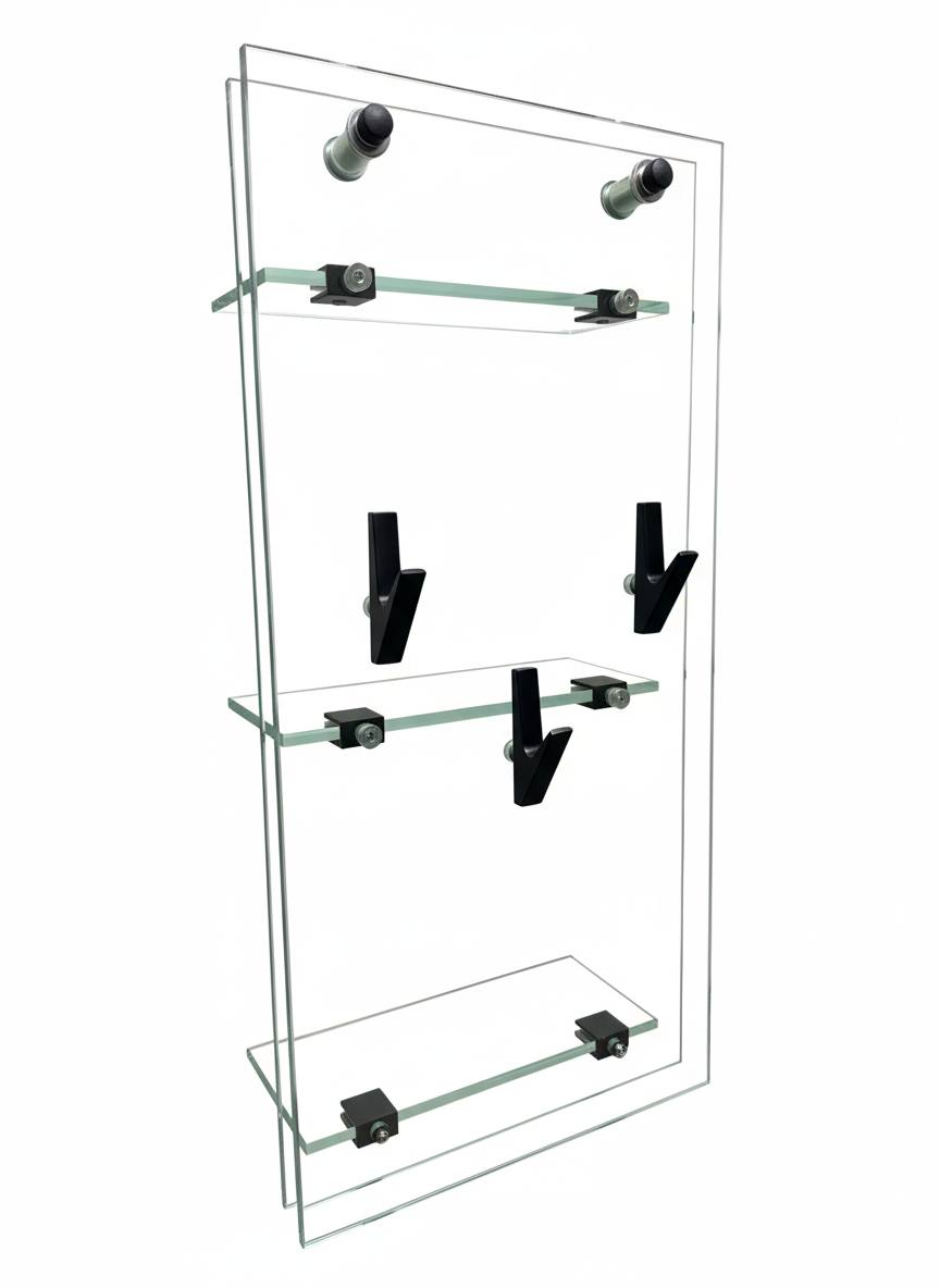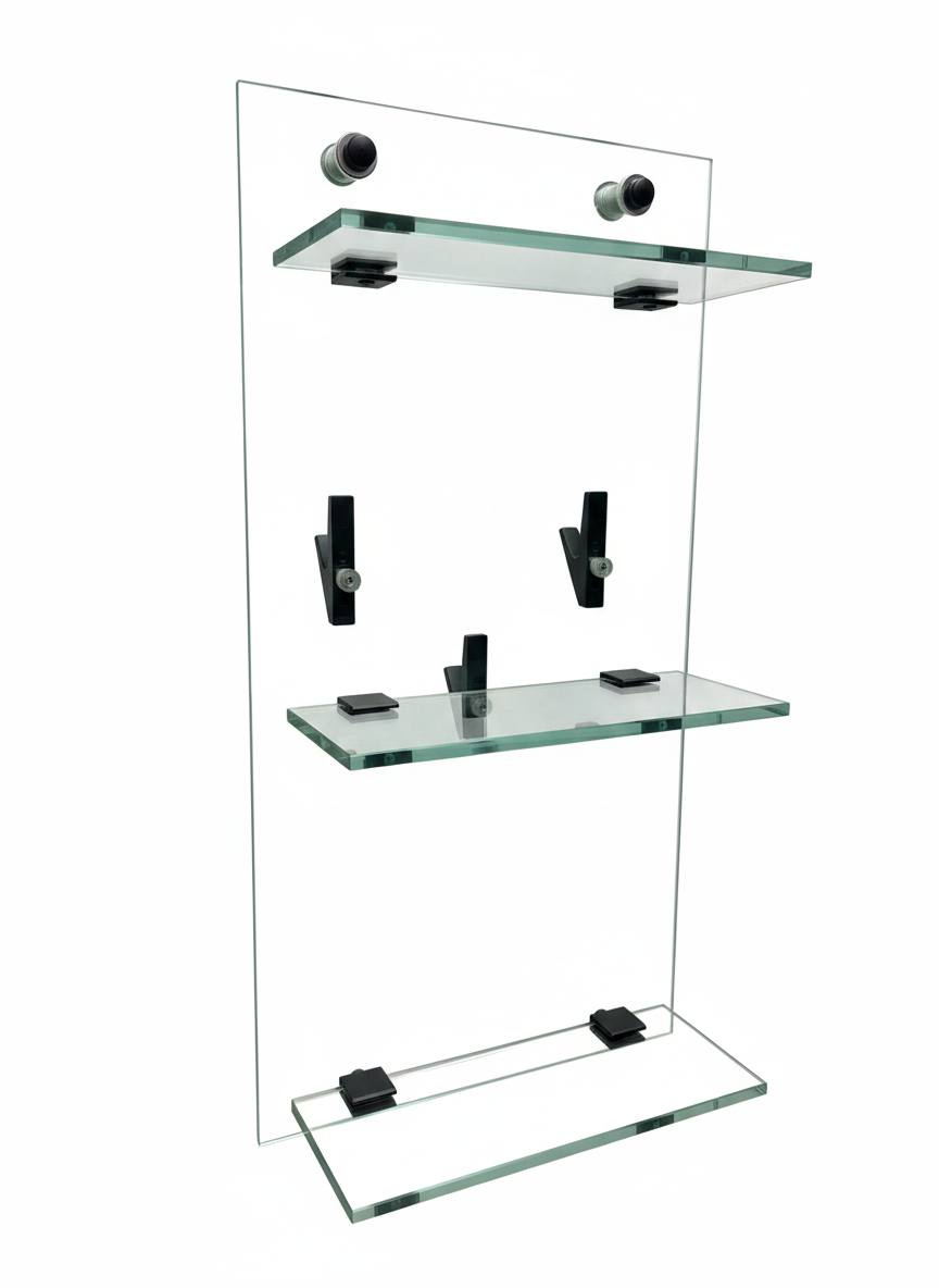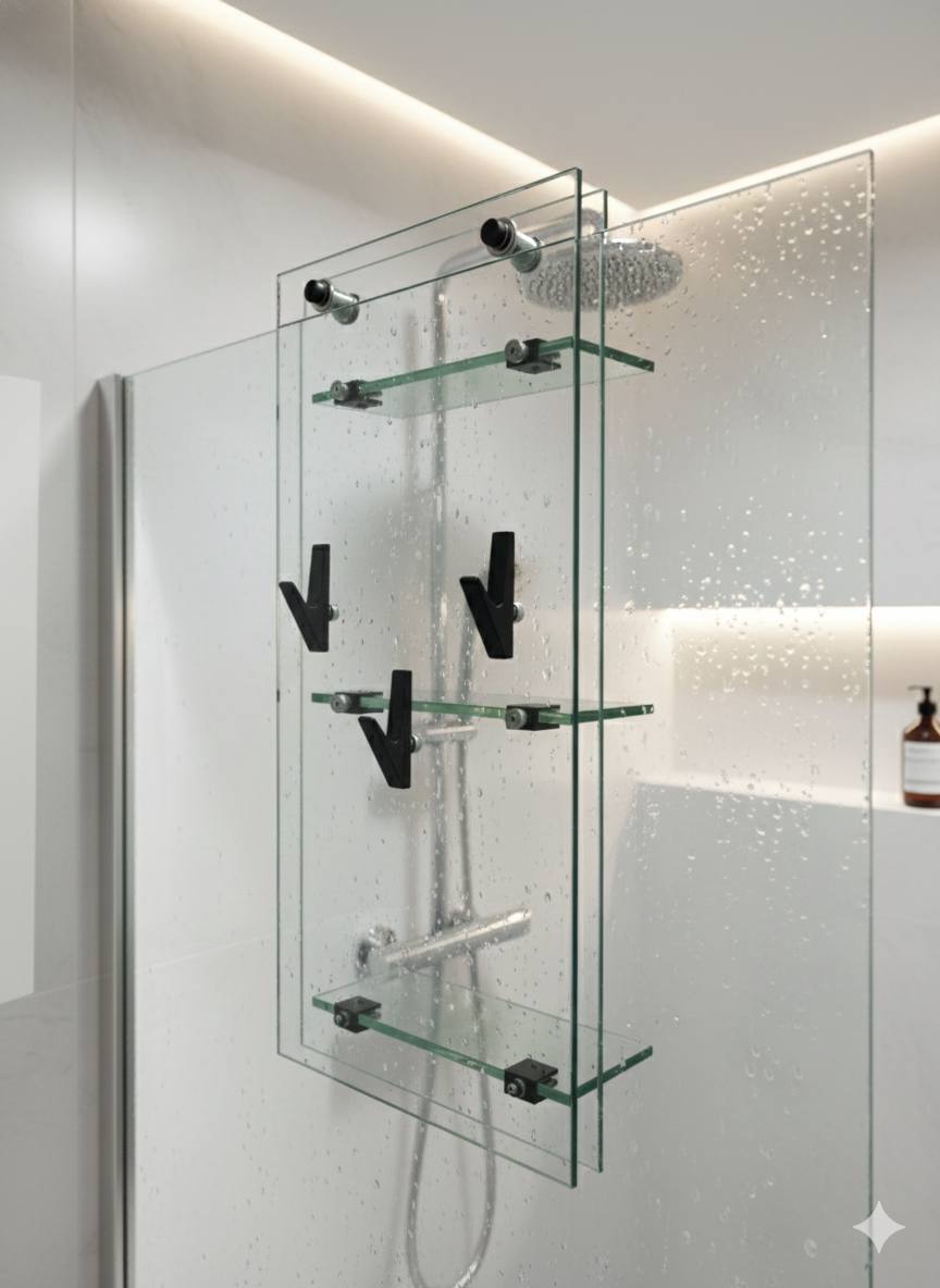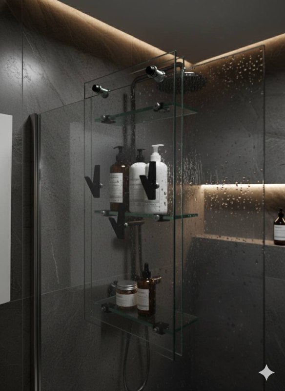 Грань — это стильная двусторонняя полка для душевой перегородки, в которой эстетика стекла сочетается с продуманной функциональностью.