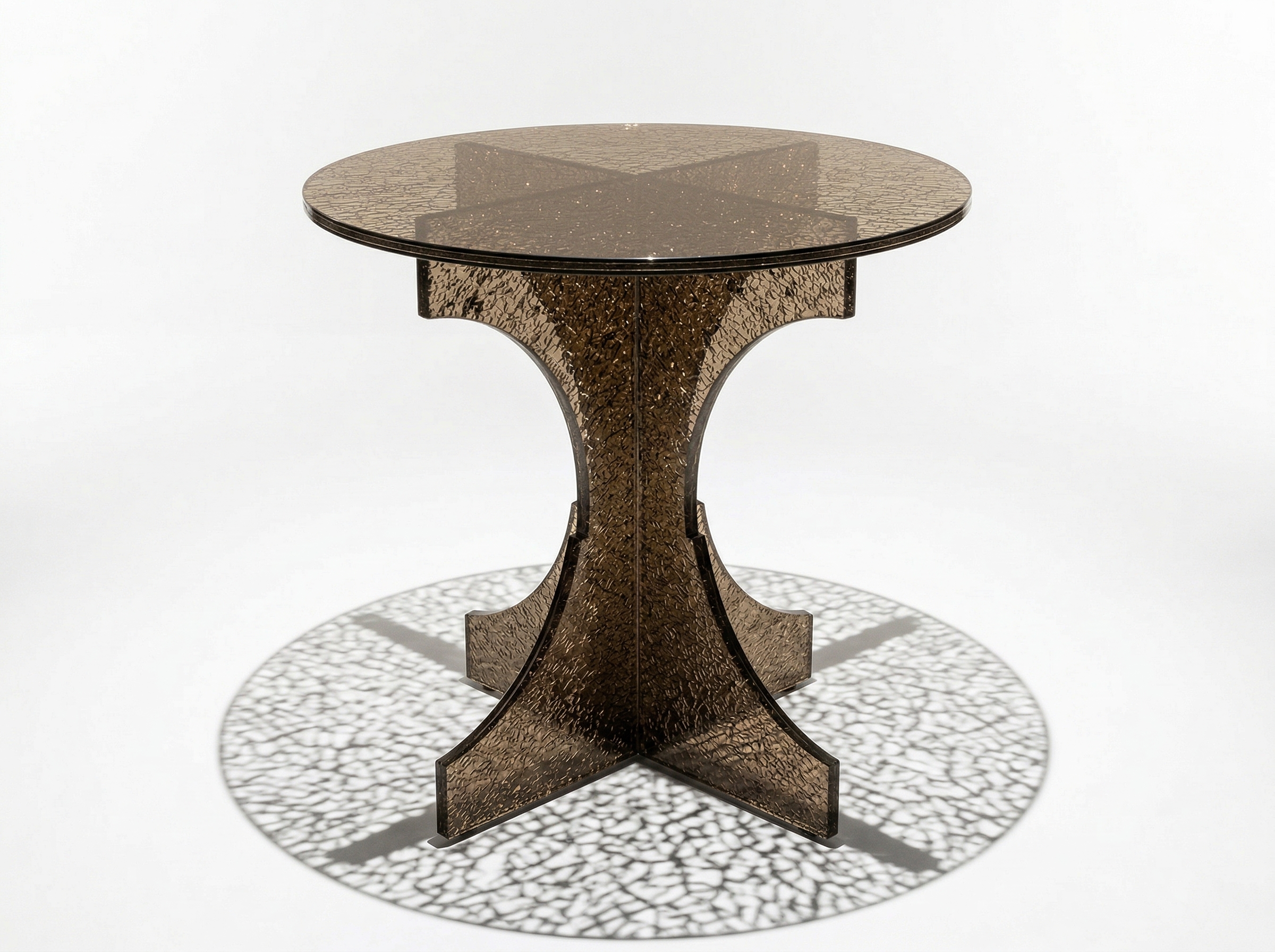 Обеденный стол «Кварц Бронза» — это игра света, формы и прозрачной глубины стекла. Его столешница выполнена из закалённого стекла с эффектом shattered glass, напоминающим природную структуру кристалла кварца: тонкие линии и переливы создают ощущение внутреннего света и живой текстуры.
