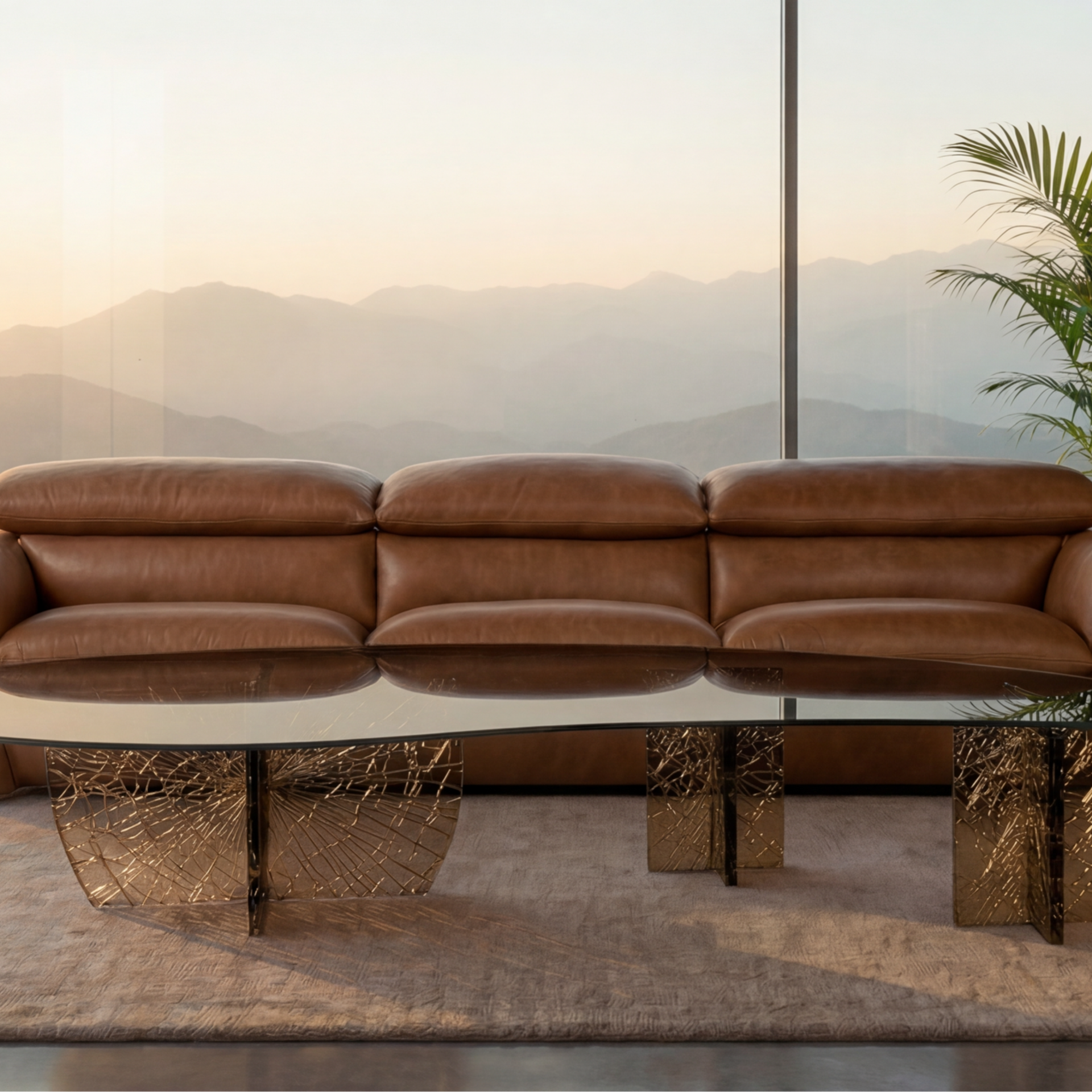 Тёплый бронзовый оттенок стекла мягко рассеивает свет, наполняя пространство уютным сиянием. Поверхность выглядит по‑разному в зависимости от освещения — днём она лёгкая и воздушная, а вечером становится глубокой и насыщенной, словно стекло хранит внутри собственное свечение.